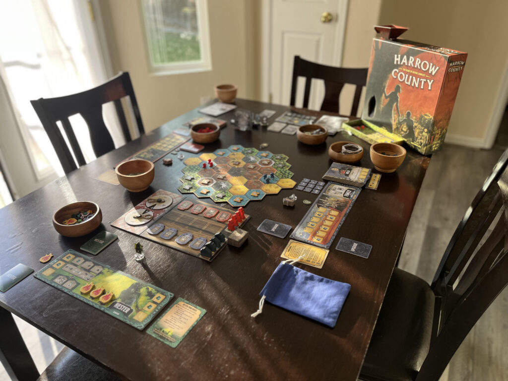 Harrow County came to me at a time in my board game life where I had been on a spree of seemingly endless euros and found myself starting to think….it’s all the same. I want to see creativity, not a money grab. Not the same mechanics, loosely slapped on to a different theme.