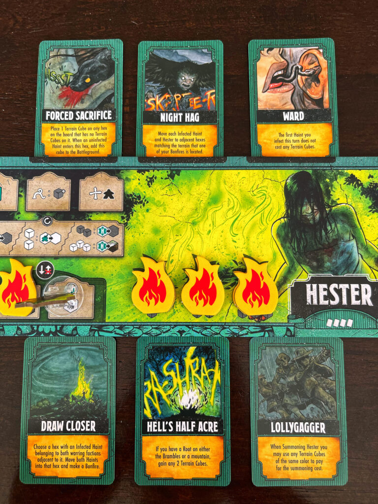 When the game is played out, it’s an absolute tug-of-war of death and curses as you try to control territories while sabotaging everyone else around you. One moment you’re building an empire of haints (your helpful minions), haunting the lands with the elegance of a backwoods Dracula, and the next you’re running from your creepy witch neighbor who’s trying to eat you for lunch. It’s all brilliant, disgusting fun.