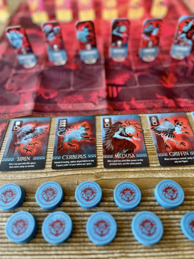 One player takes the Gods, the other takes the Monsters. Each side has 14 tokens, and the goal is simply to place all your tokens on the 6×6 grid board first (or 7×7 and 19 tokens for an optional variant). On your turn you may either move or use a figure’s power.